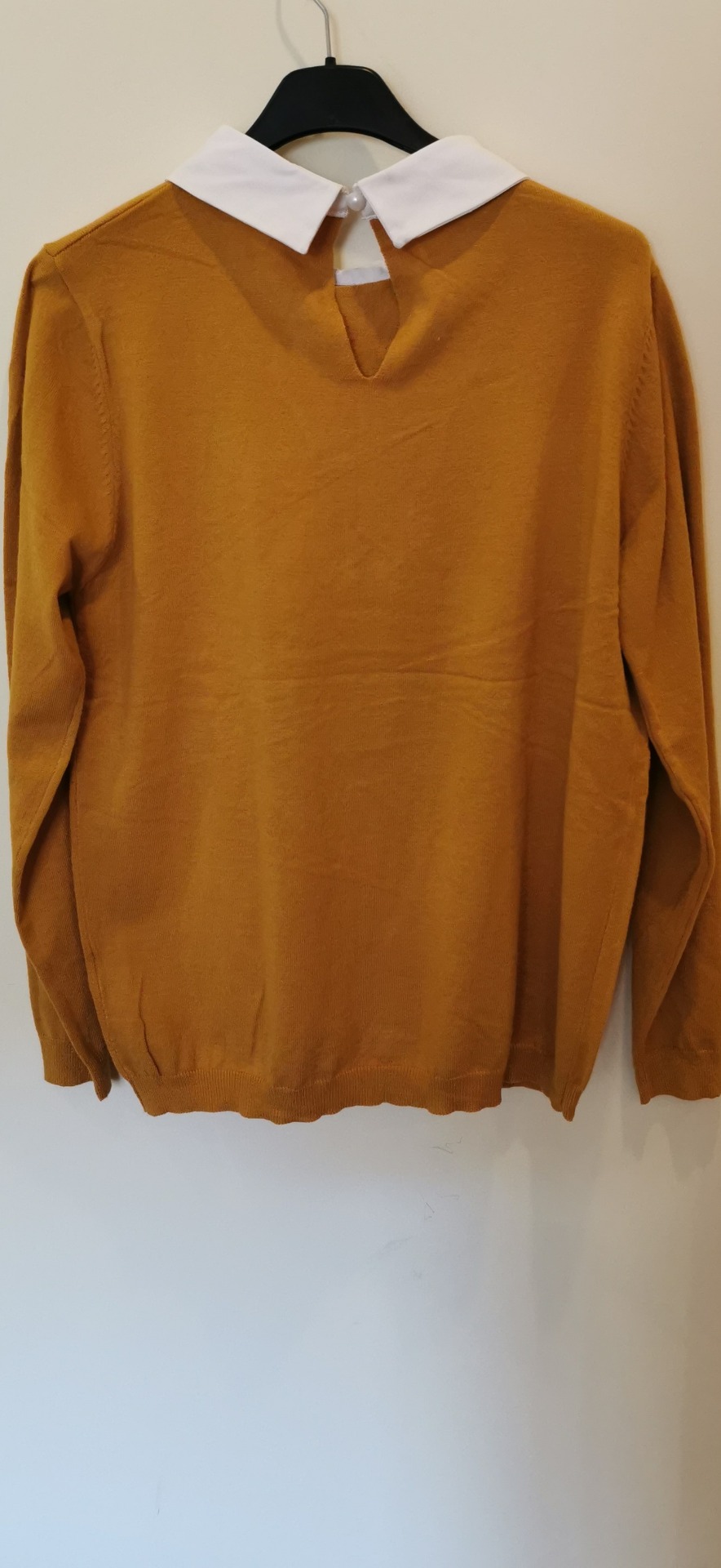 Camisola elegante, malha, com laços e cristais, na parte de trás com botão "pérola". Tamanho único.
