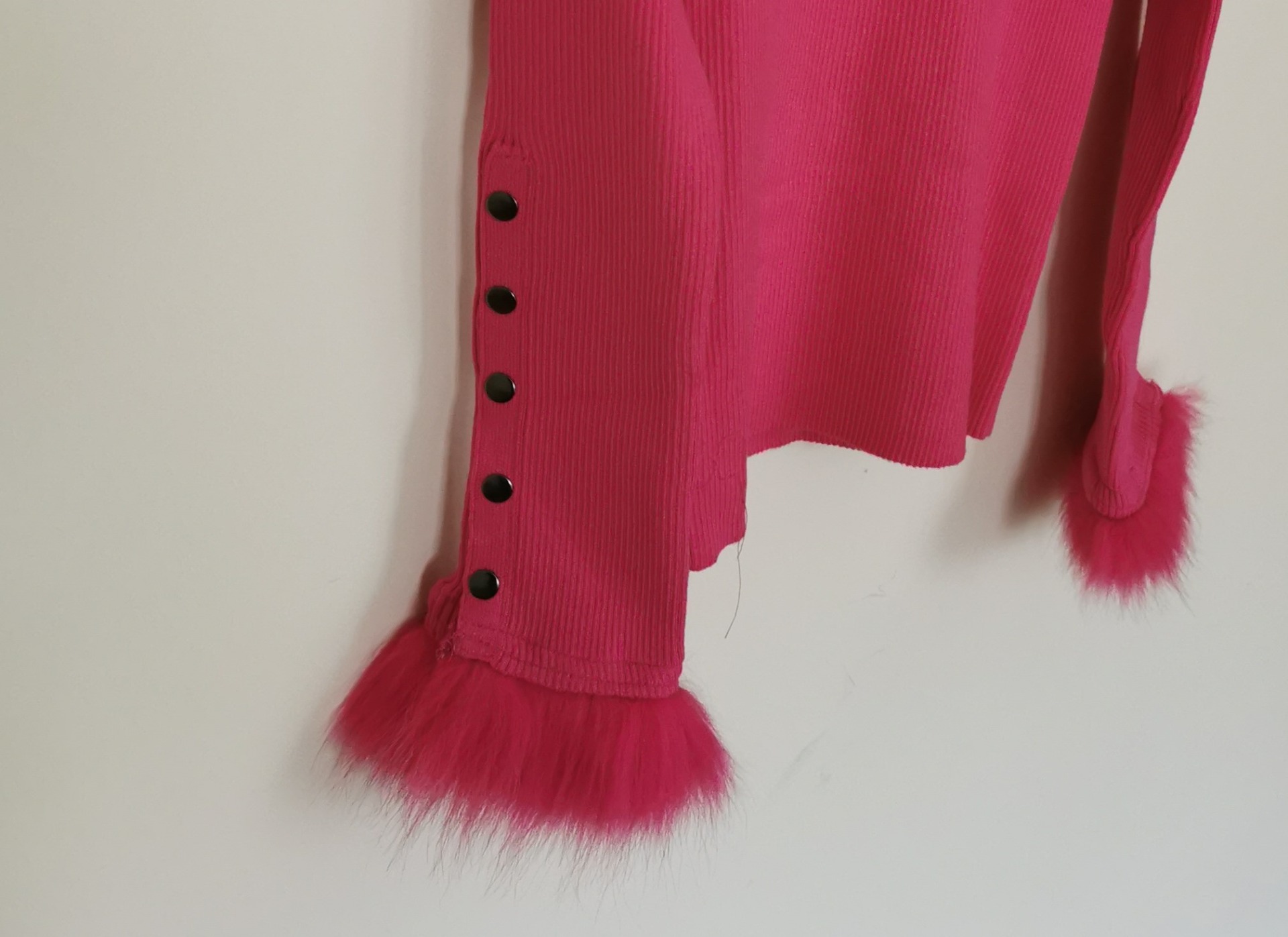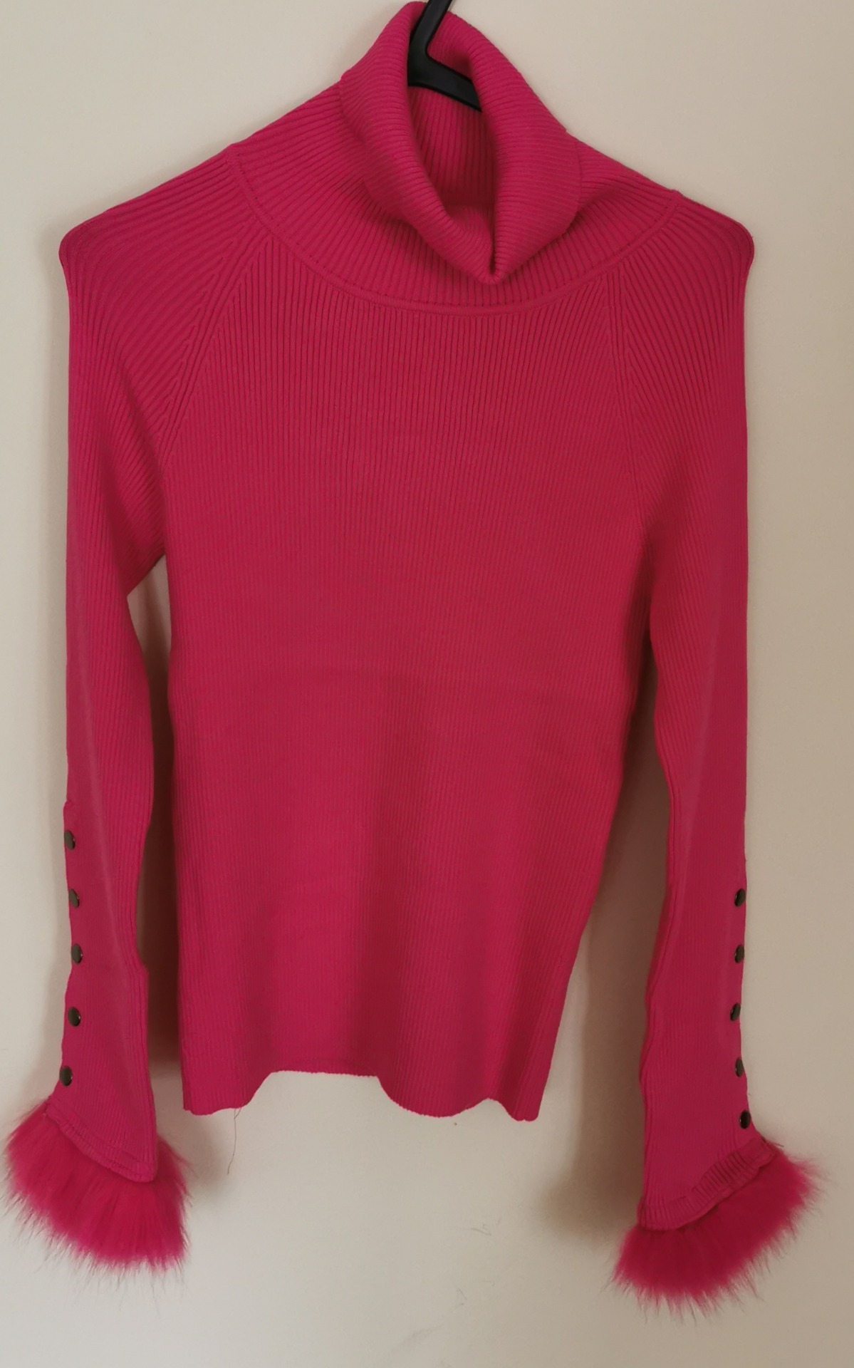 Camisola rosa de malha canelada, com as mangas com o com molas e um toque precioso de pêlo no final da manga. :)