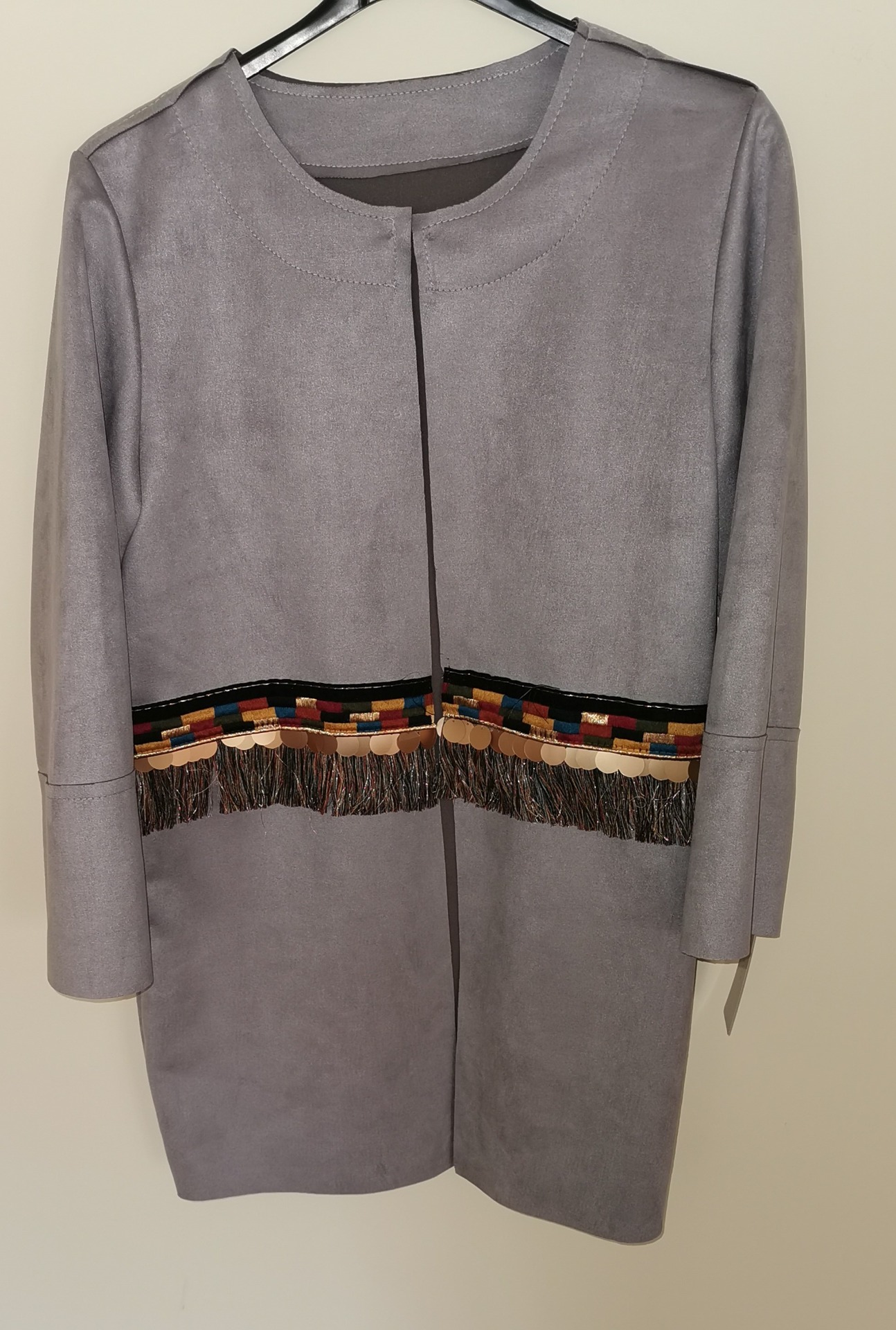 Casaco cinzento em "pele de pêssego" com uma faixa lindíssima a dar um toque de requinte. :)