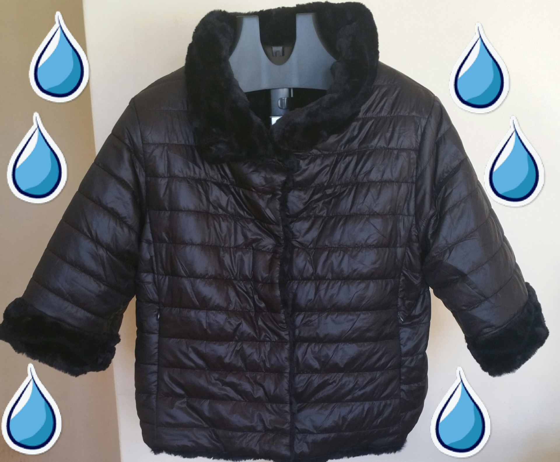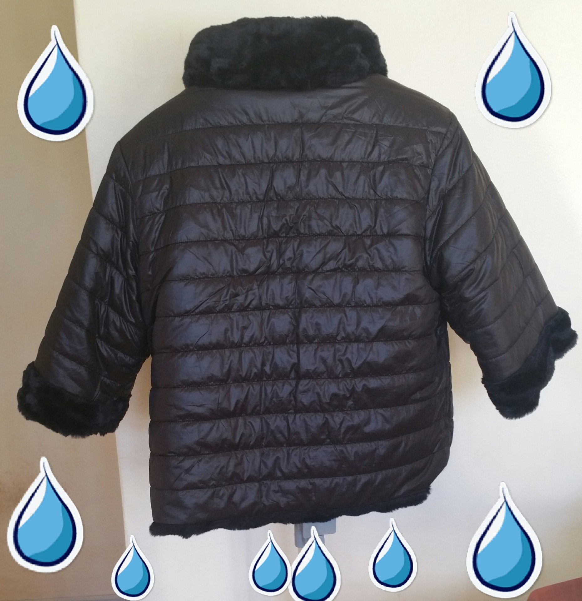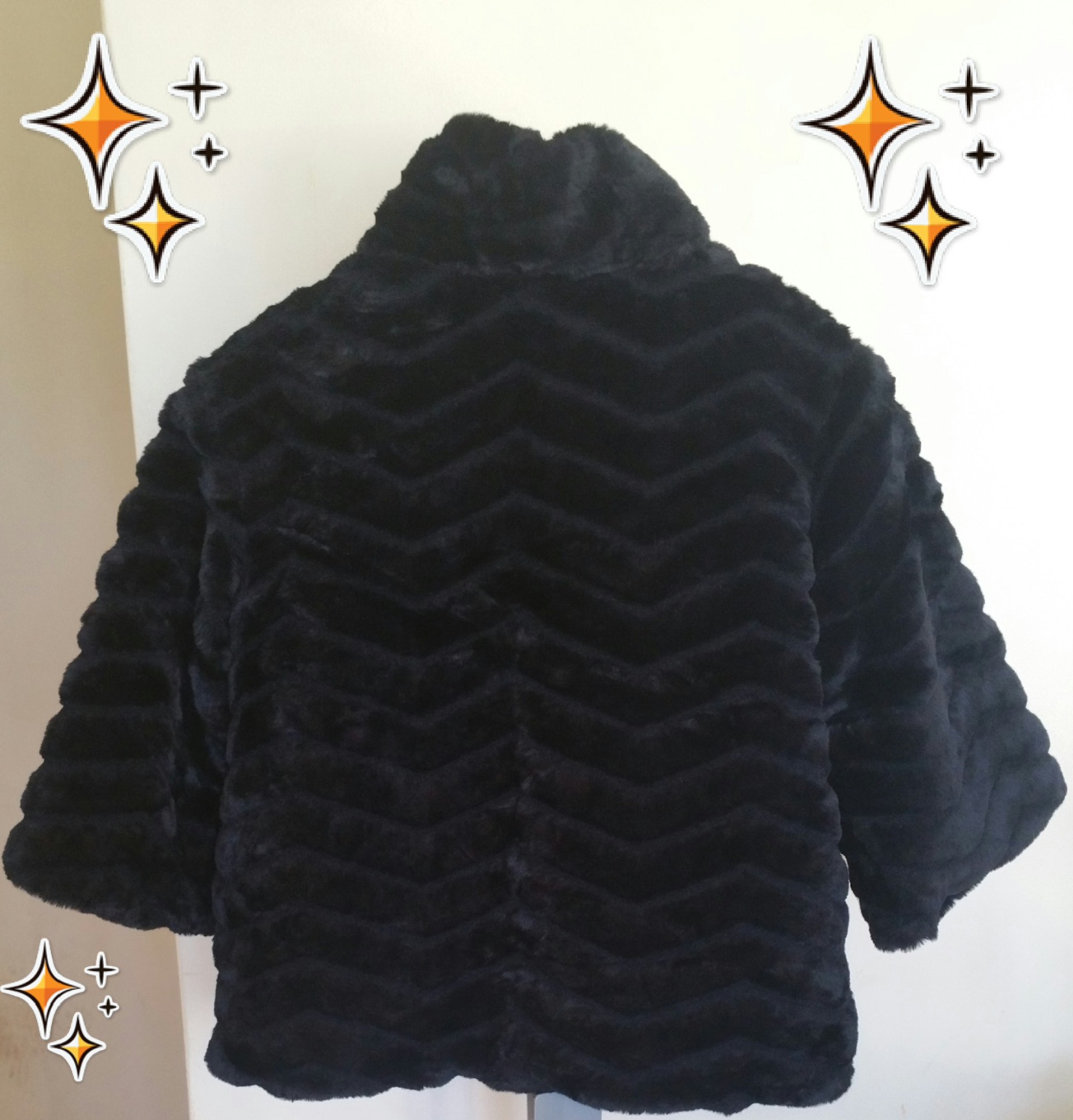 Casaco de pelo preto, com botão com pérolas e brilhantes. Reversível, Tamanho XL. Este casaco é formal vestido com o pelo e o botão de pérolas e brilhantes, mas como é reversível torna-se num casaco menos formal porque é material impermeável e o botão não se vê, apertando vom molas, tem bolsos embutidos.
