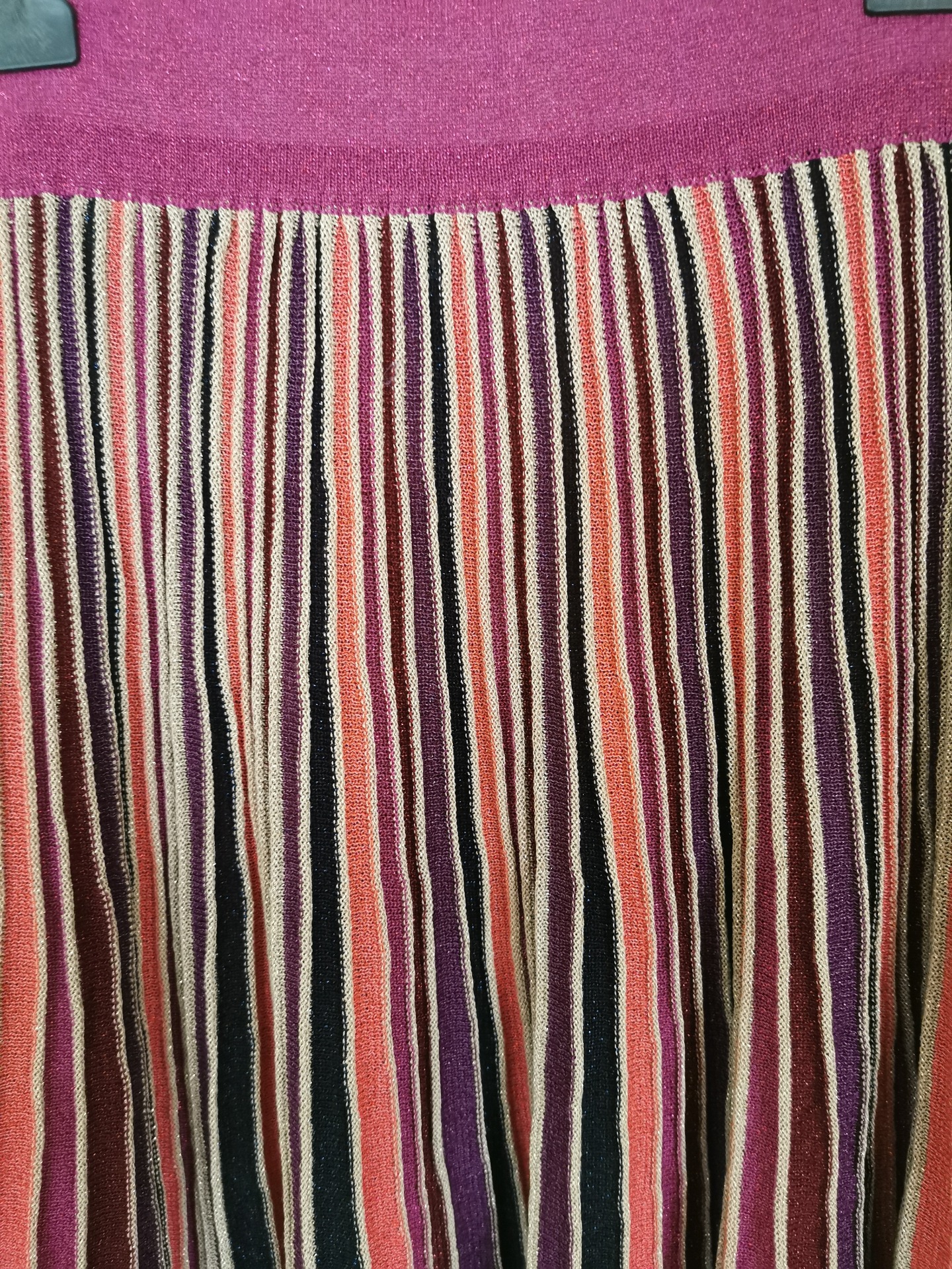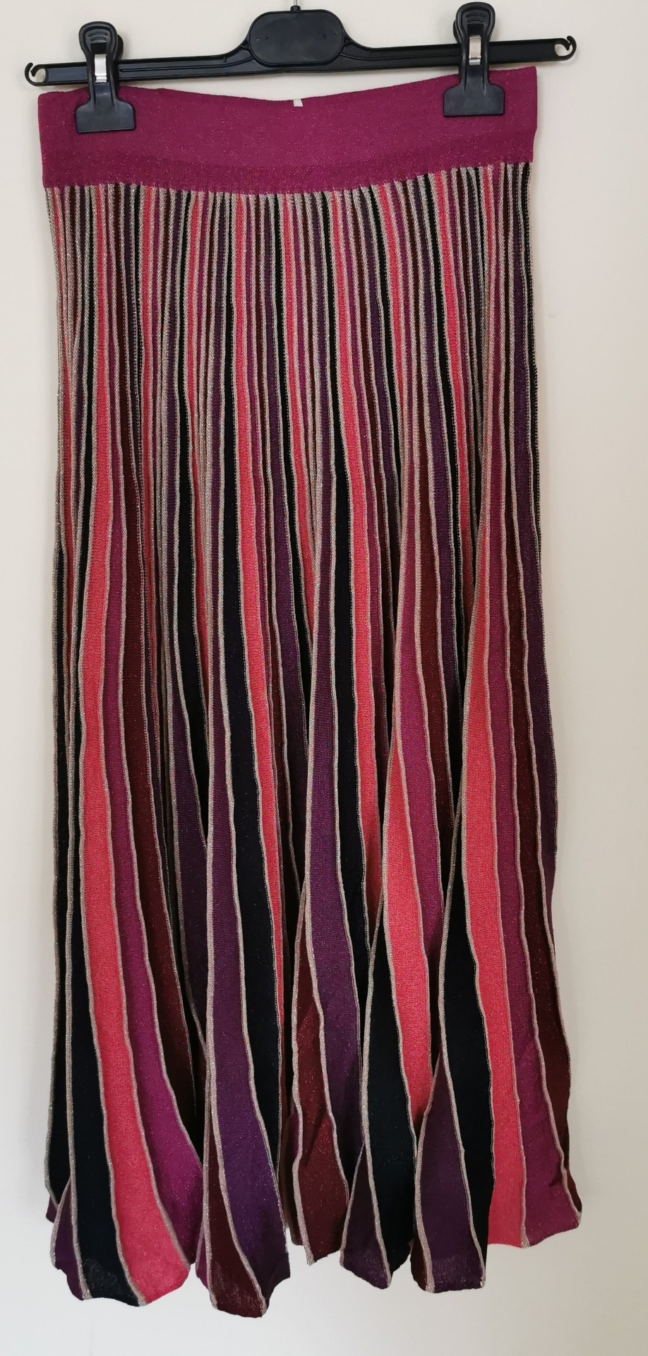 Saia de malha ás cores de malha canelada, com dourado embutido no fio da malha. Com pregas mais estreitas perto da cintura e alarga para baixo fica com um toque que define o corpo. Esta saia com a camisola faz um conjunto lindo:).