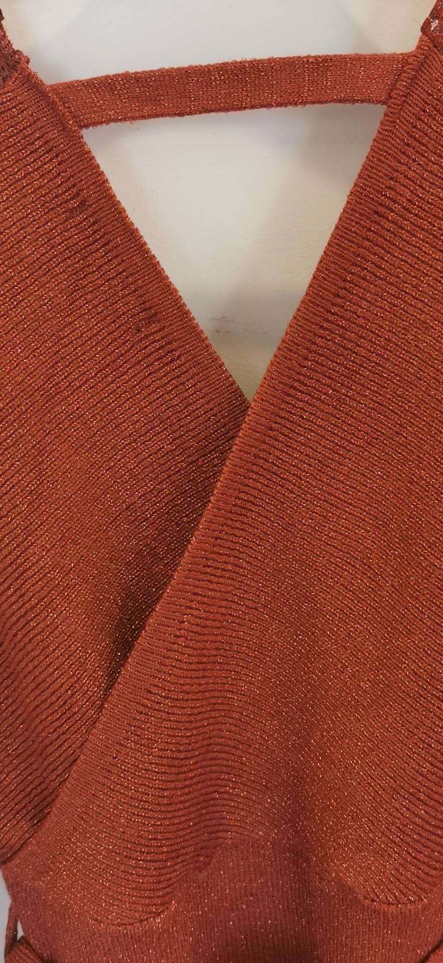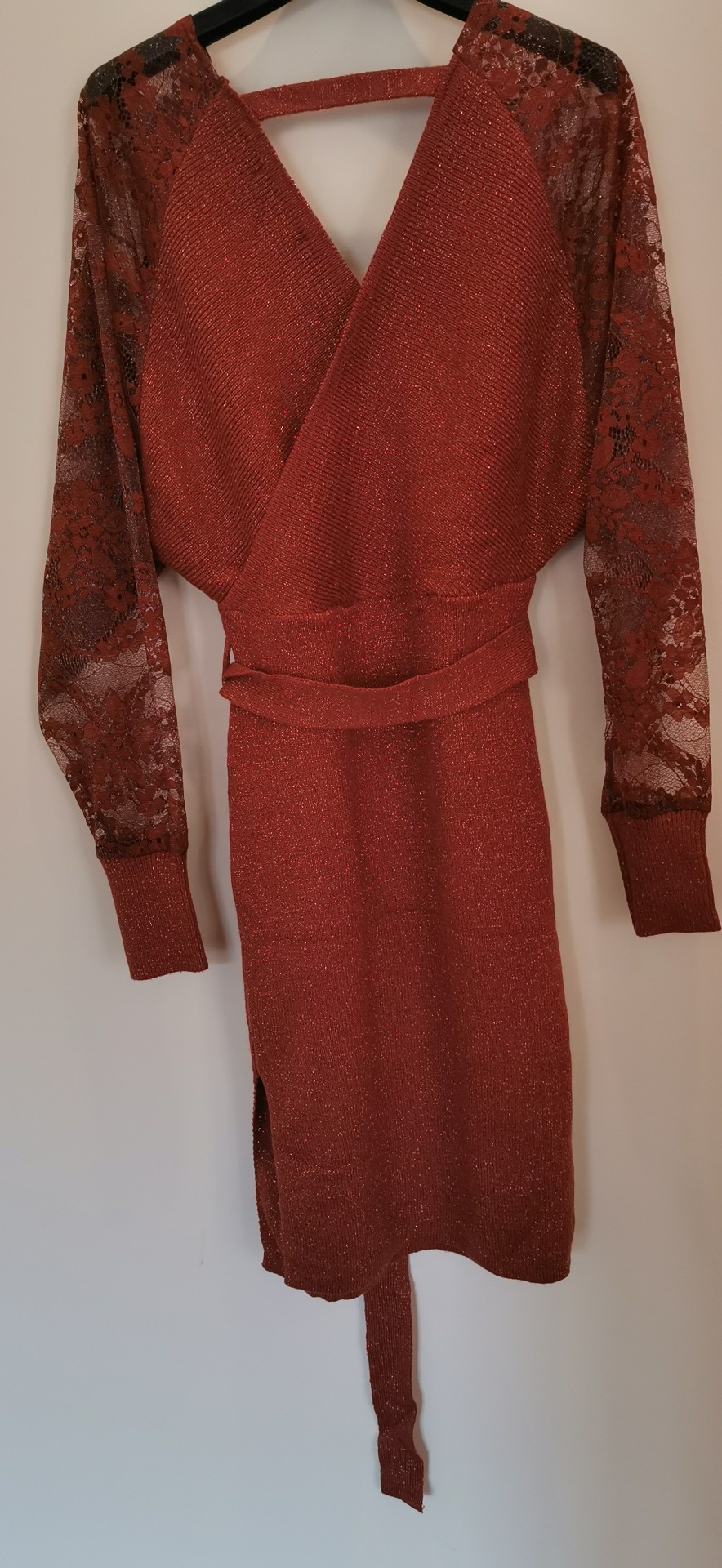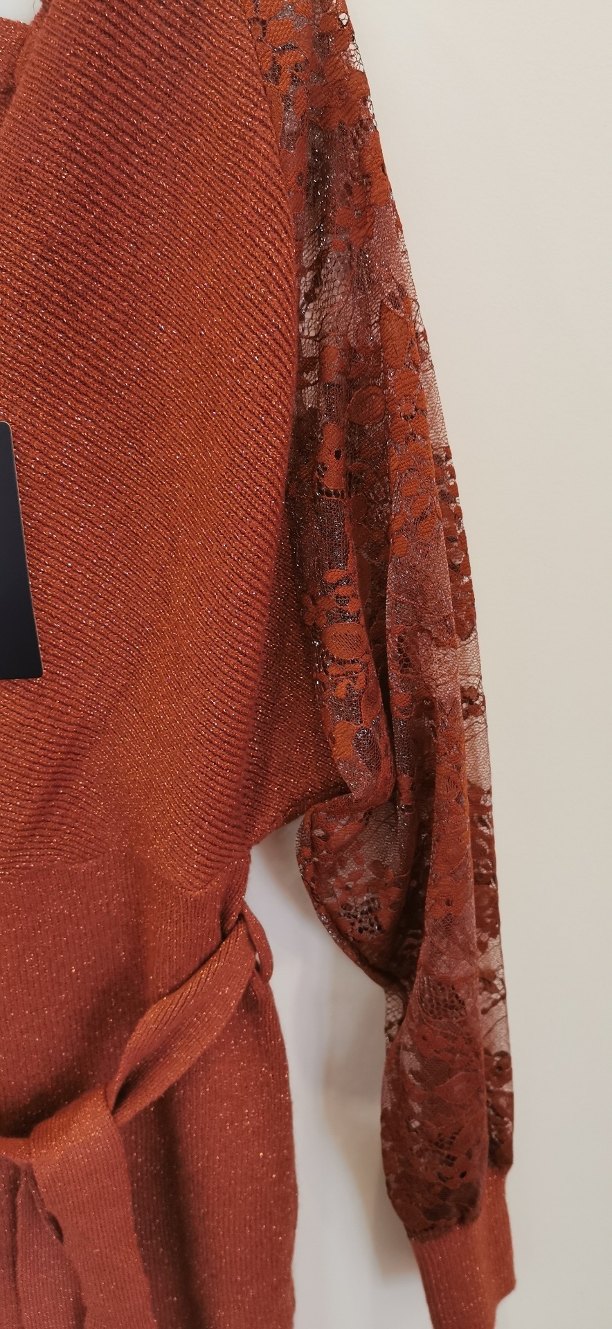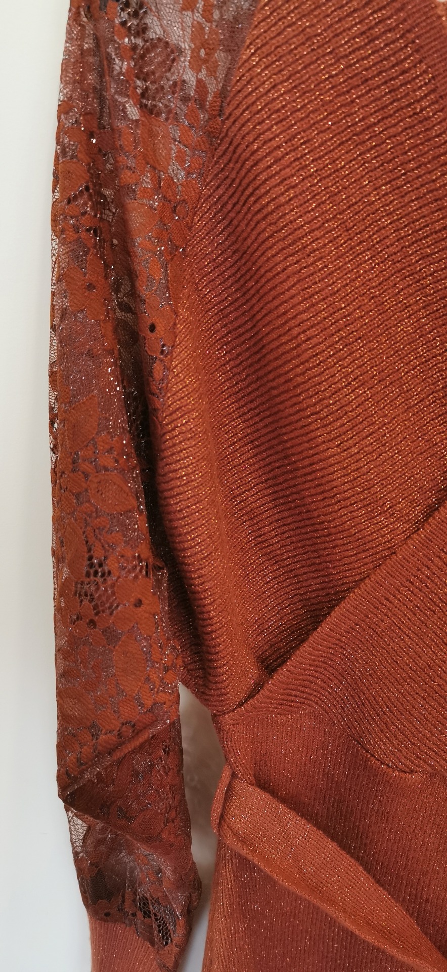 Vestido cor de "tijolo". Elegante de malha e renda nas mangas. Tamanho único.